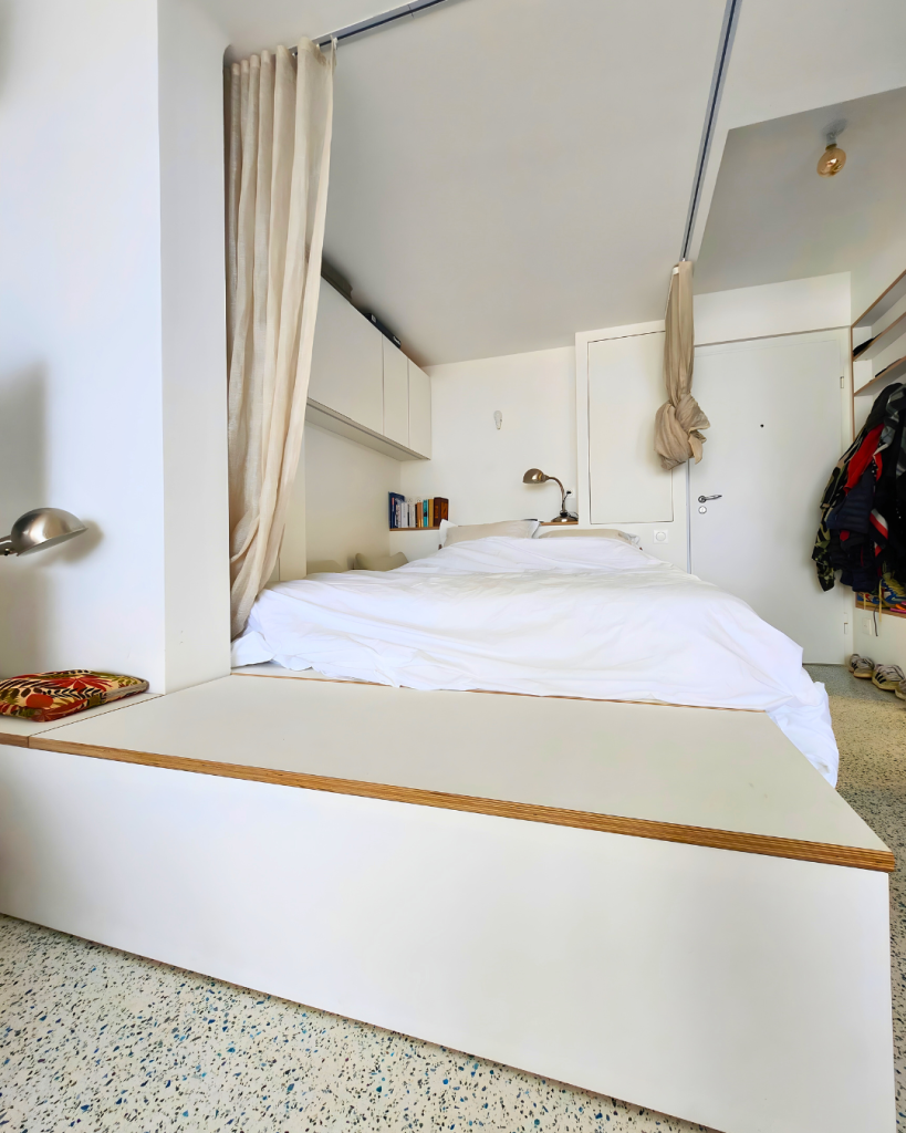 Création d’un ensemble de couchage multifonctions conçu pour optimiser le mieux l’espace. Ce lit estrade sur mesure intègre de large tiroirs de rangement en partie basse, libérant ainsi de l’espace au sol. L’agencement est complété par des placards suspendus et une petite niche au niveau de la tête de lit. Le choix du blanc associé aux chants en bois apporte plus de luminosité à cet agencement.