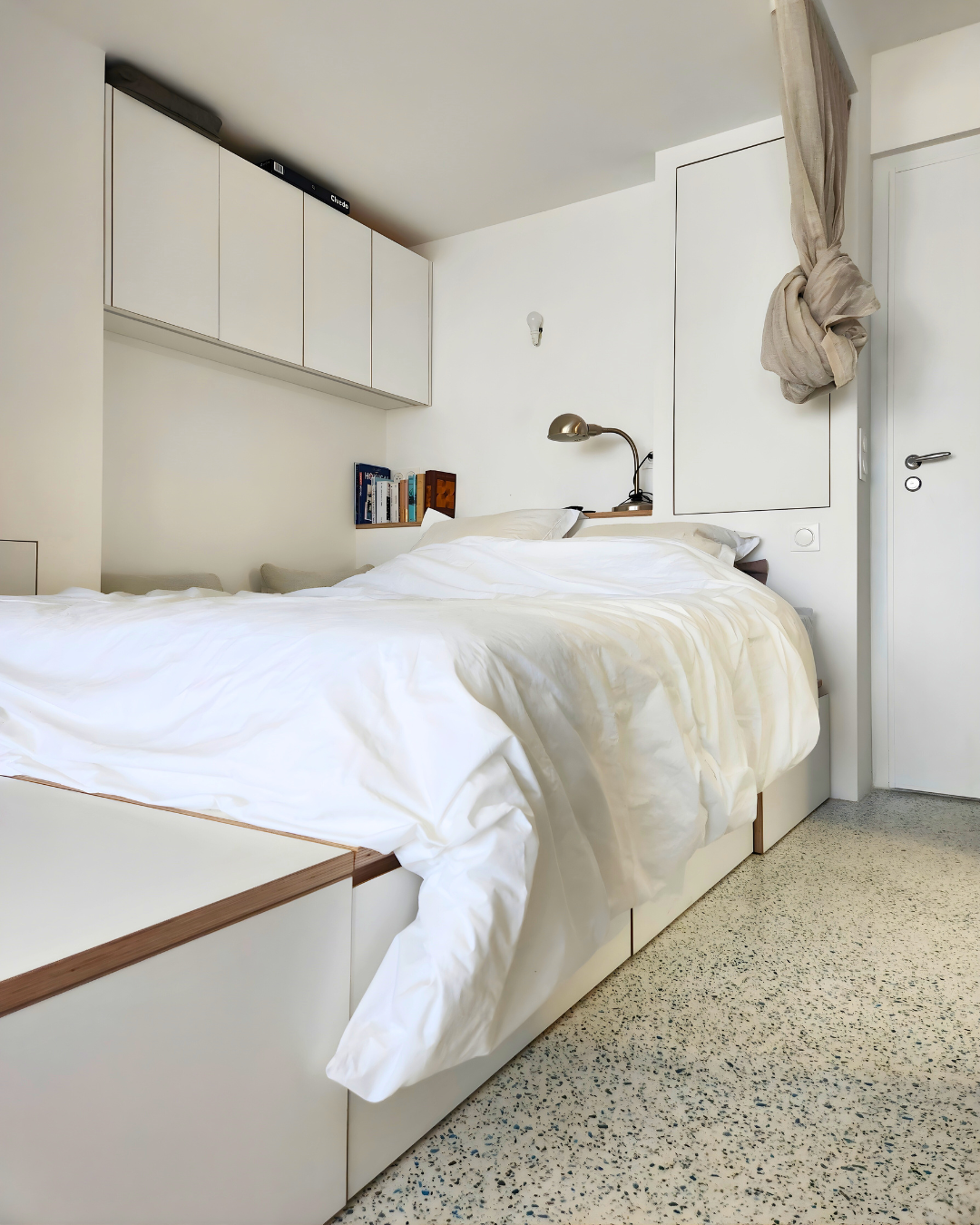 Création d’un ensemble de couchage multifonctions conçu pour optimiser le mieux l’espace. Ce lit estrade sur mesure intègre de large tiroirs de rangement en partie basse, libérant ainsi de l’espace au sol. L’agencement est complété par des placards suspendus et une petite niche au niveau de la tête de lit. Le choix du blanc associé aux chants en bois apporte plus de luminosité à cet agencement.